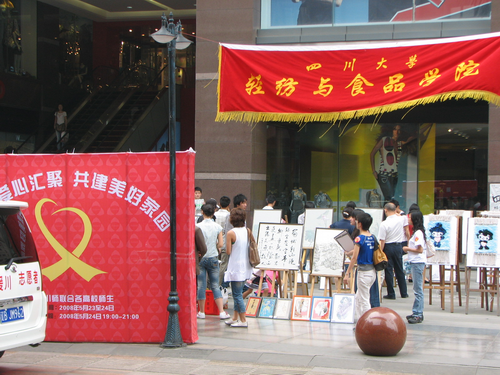 纺织服装系和四川师范大学联合举办的“抗震救灾 情系汶川”师生作品义卖活动在红星路步行街第一城举行,两校师生无偿捐献出自己的专业作品,这次义卖活动筹款4万多元全部上交四川慈善总会捐献给了灾区人民。 我们纺织工程专业在教研室组织下,由赵敏老师带领积极参加了这次义卖活动。赵敏老师捐出多幅自己的蜀锦作品,同学捐出完成专业课作业的作品――纯手工编织的工艺挂毯,更有兰井波、吴娟、杨燕、张芳、薛清华、赵玲等同学用自己的获奖作品参加了义卖活动。大家齐心协力,只希望可以多为灾区的同胞们多筹集哪怕是一元钱。 我们的活动在8bo足球比分