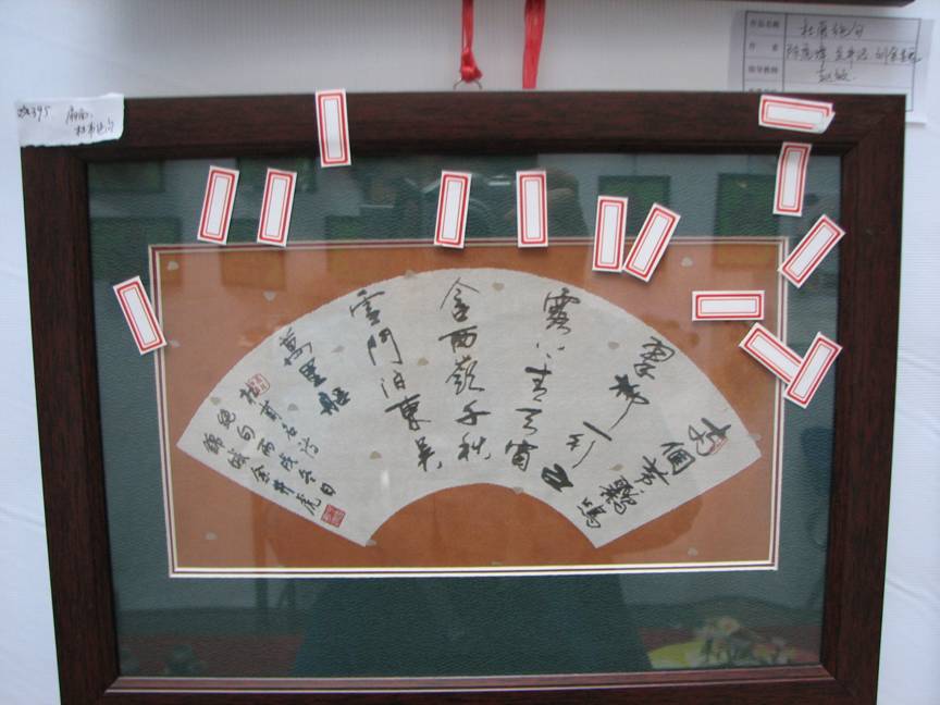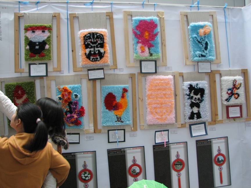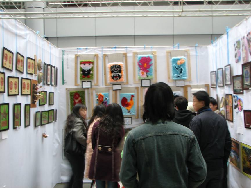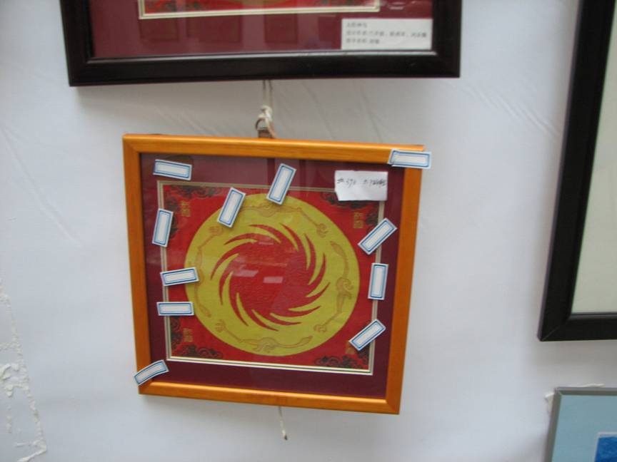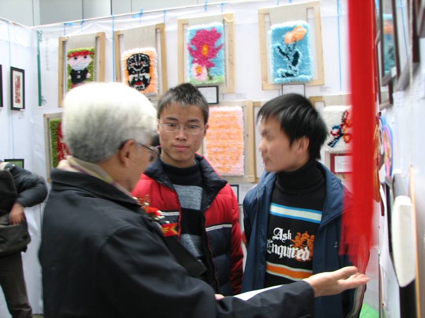 在经过评委们的仔细评定后,我们参加的16件作品全部入围决赛。在决赛中我们获得了一个金奖,三个银奖的好成绩。其中由陈虎章、兰井波、刘余魏创作的蜀锦作品:扇面——杜甫绝句获得了金奖,太阳神鸟获得了银奖。由马娟制作的栽绒挂毯——张飞脸谱获得了银奖,由区淑莹制作的栽绒挂毯——唤日获得了银奖� 参加本次大赛的相关图片: