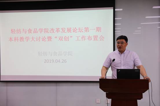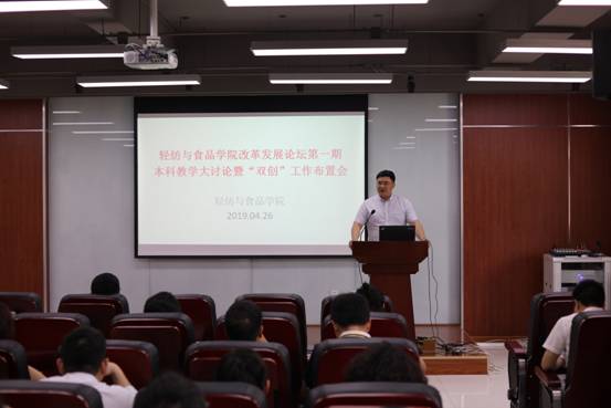 2019�4�26日下午,学院在皮革楼215报告厅,成功举办首期改革发展论坛——本科教育改革与发展大讨论及“双创工作”布置会,全院教职员工参加了本次大会�