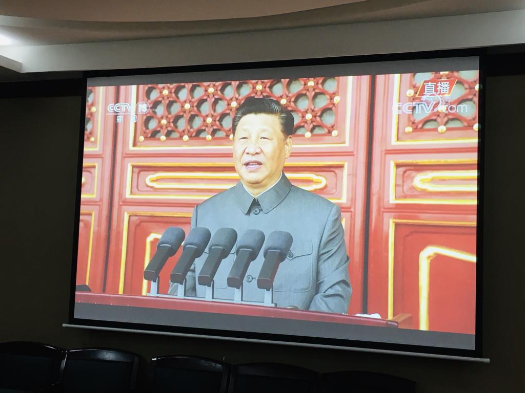 组织领导班子成员、两委委员、党支部负责人、系所负责人、科级干部等在皮革楼209会议室集体收看庆祝大会实况转播,其余师生按照既定安排也以手机、电脑、电视等多种形式认真收听收看庆祝大会。