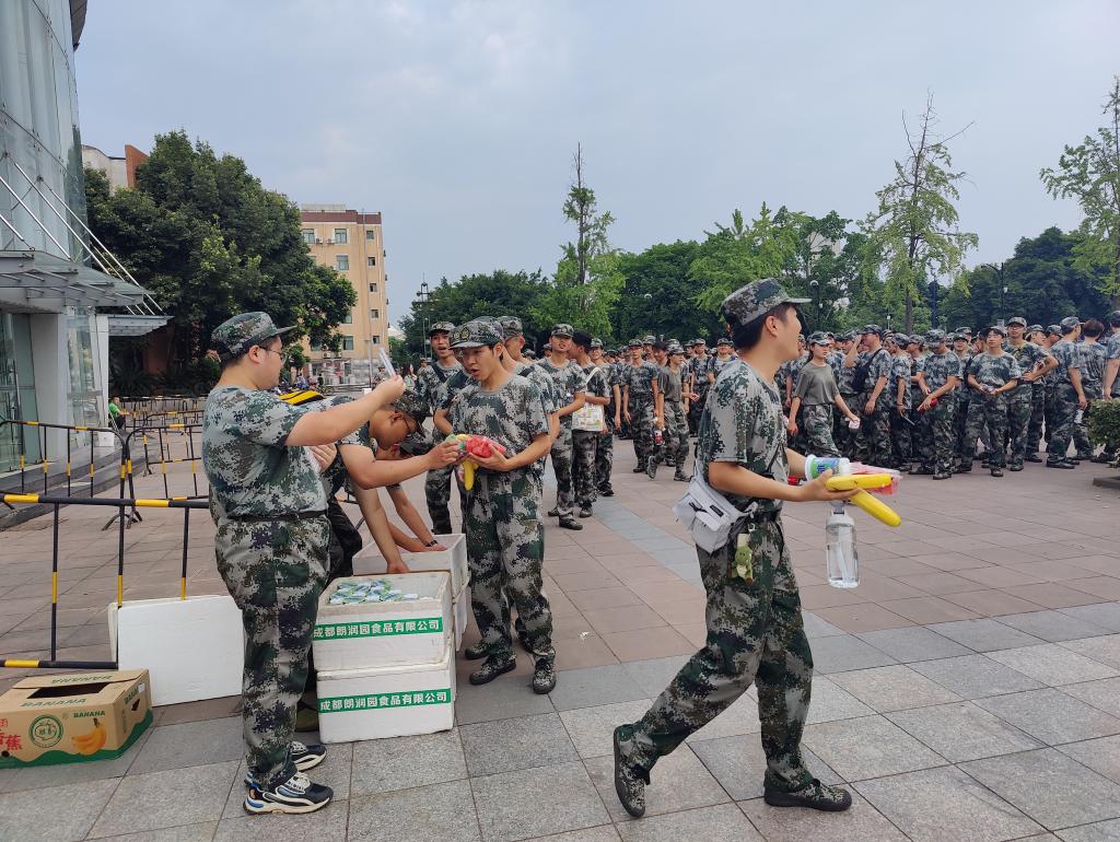 领导不仅给予了同学们精神上的鼓励和支持,也为全体参训学生带来了水果、饮料等慰问品。辅导员贺婷老师、余昕玲老师以及各连队教官共同组织完成分发工作,收到慰问品的同学们在欢欣雀跃之余,也不忘对领导老师们表达感谢之情。