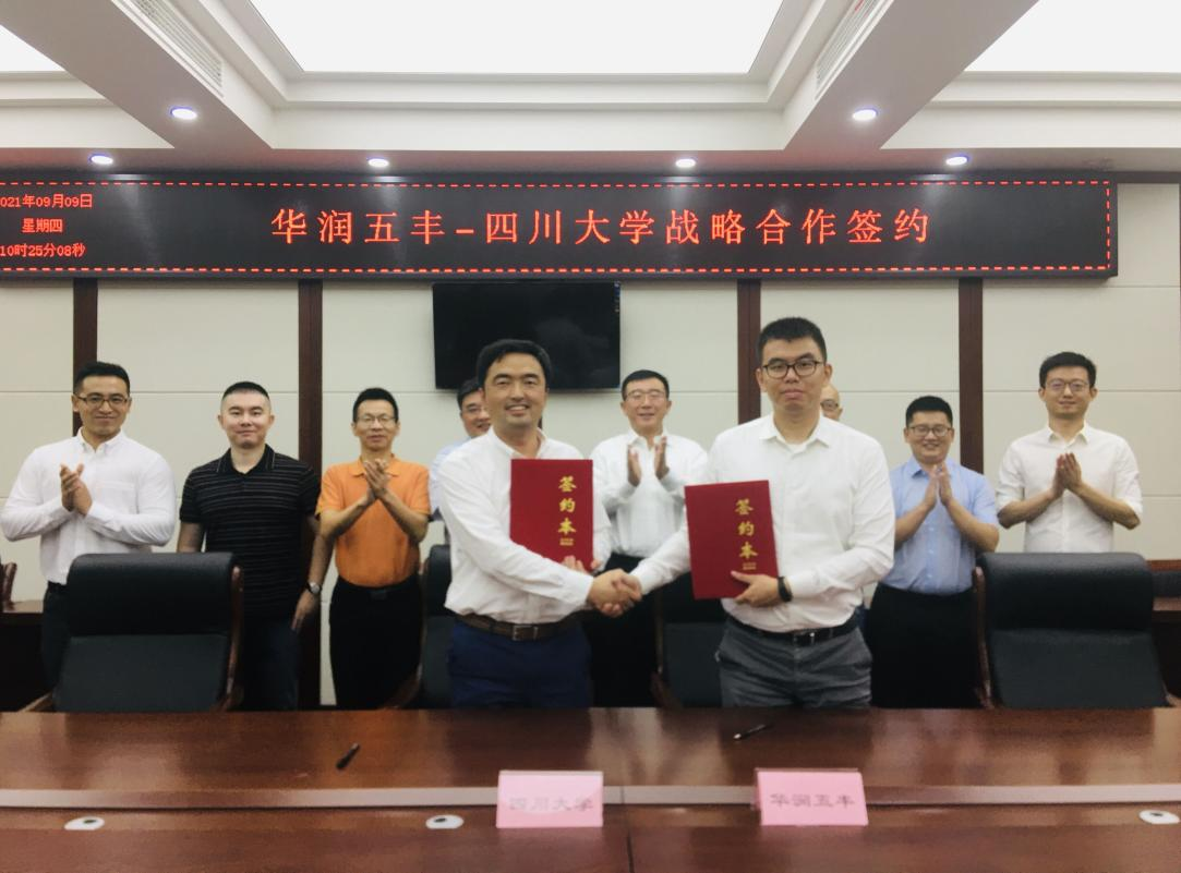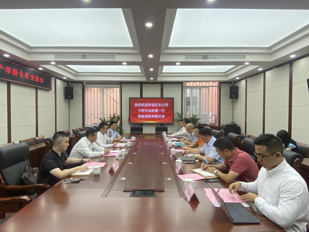 2021�9�9日上午,华润五丰集团党委书记、总经理于舒天带领集团战略发展部副总经理兼五丰黎红党委书记、总经理刘宜朋、华润五丰集团战略发展部高级经理吴野牧、五丰黎红公司第一党支部书记、研发总监幸勇到校考察交流�四川大学科学技术发展研究院科技合作与技术转移部副部长高德友、四川大学轻工科学与工程学院党委书记刘晓虎、副院长何强、副院长肖凯、食品工程系赵志峰副教授等在纺工附楼205会议室参加本次交流会。会议由何强副院长主持�