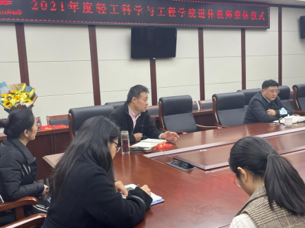 肖凯副院长、皮革教工党支部书记李正军、纺织服装系(纺研所)教工党支部书记顾迎春、离退休教工党支部书记李慧及教师代表程飞分别对两位退休教师表达了衷心的感谢与祝福。