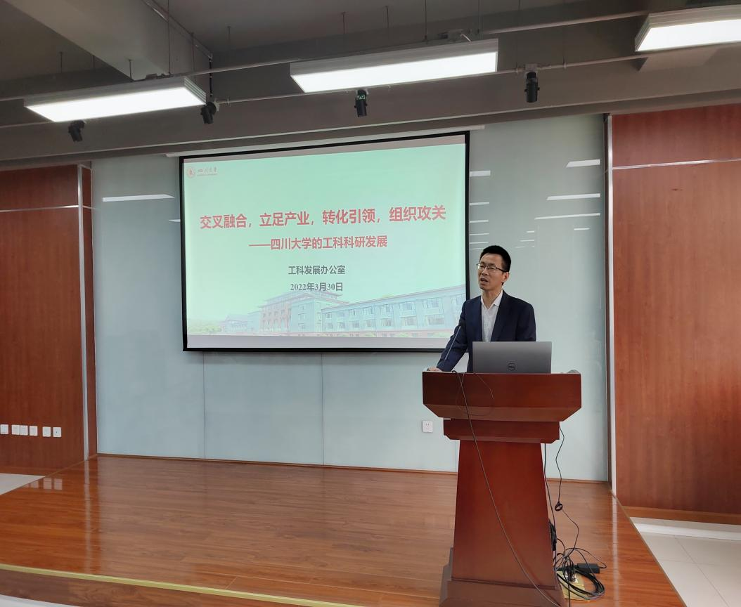 科研院工科发展办公室高德友主任向与会教师作了题为“交叉融合,立足产业,转化引领,组织攻关—四川大学的工科科研发展”的主题报告,报告围绕学校工科情况与发展措施、学校科技成果转化与校地企合作、省市科技创新支持政策等三个方面进行介绍,并就8bo足球即时比分