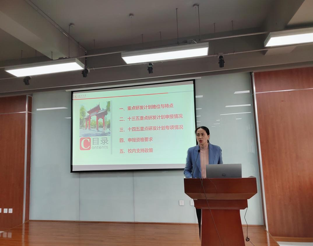 科研院重大项目管理科张滟科长从重点研发计划的地位与特点、十三五重点研发计划申报情况、十四五重点研发计划专项情况、申报资格要求及校内支持政策等五个方面进行了详细的政策宣讲。