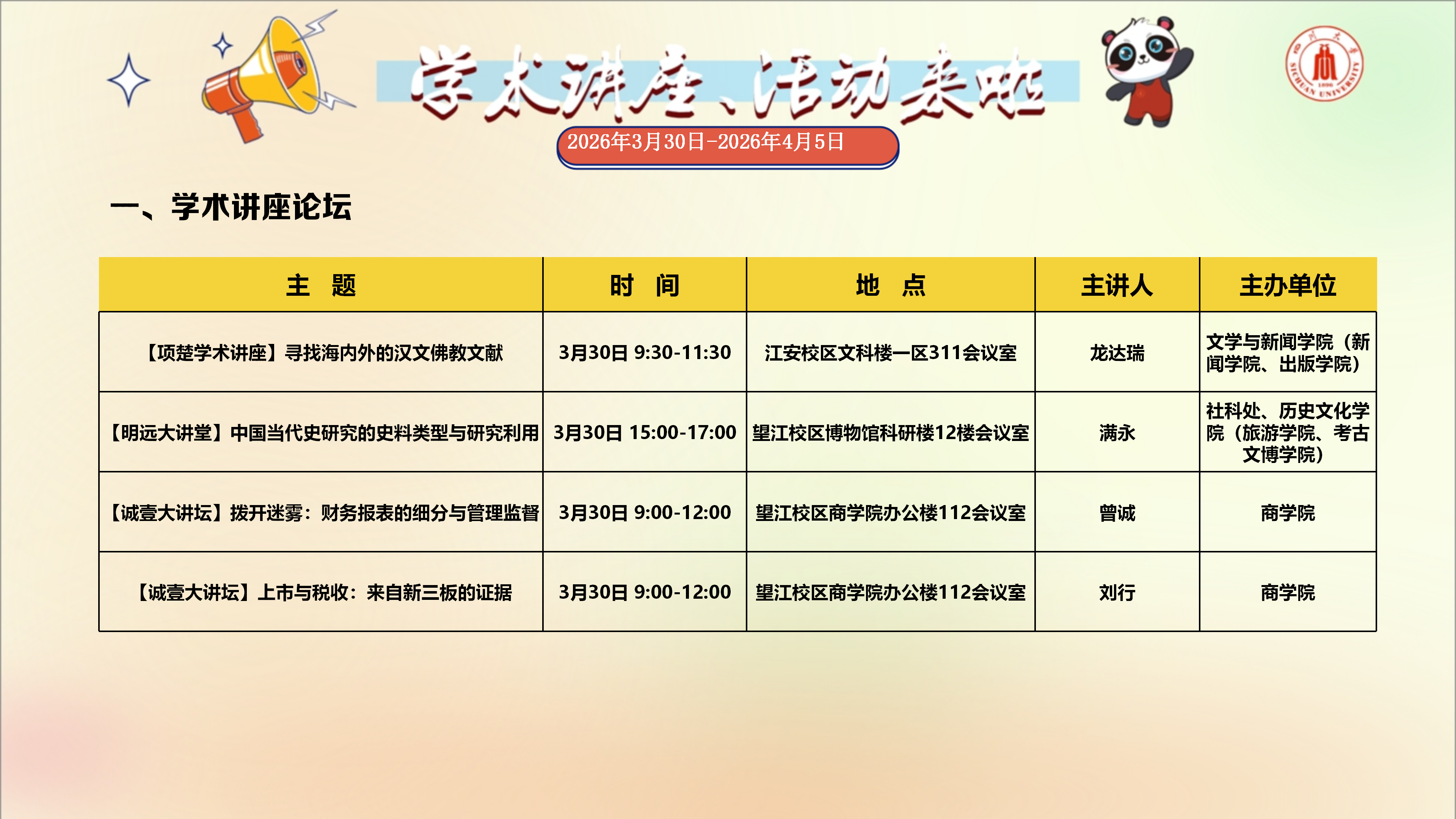 学术讲座与校园文化活动预告(2026年3月30日-2026年4月5日)
