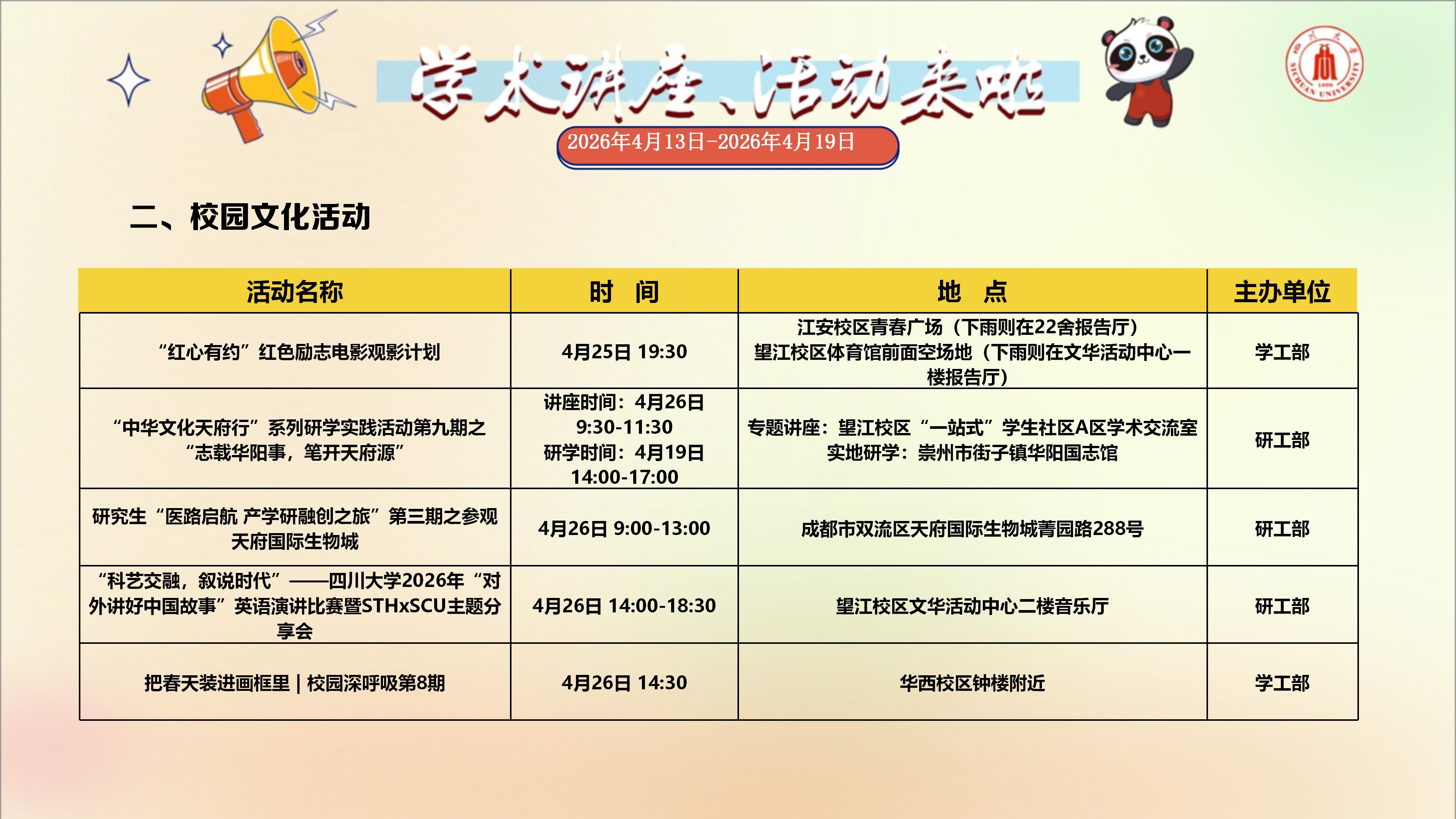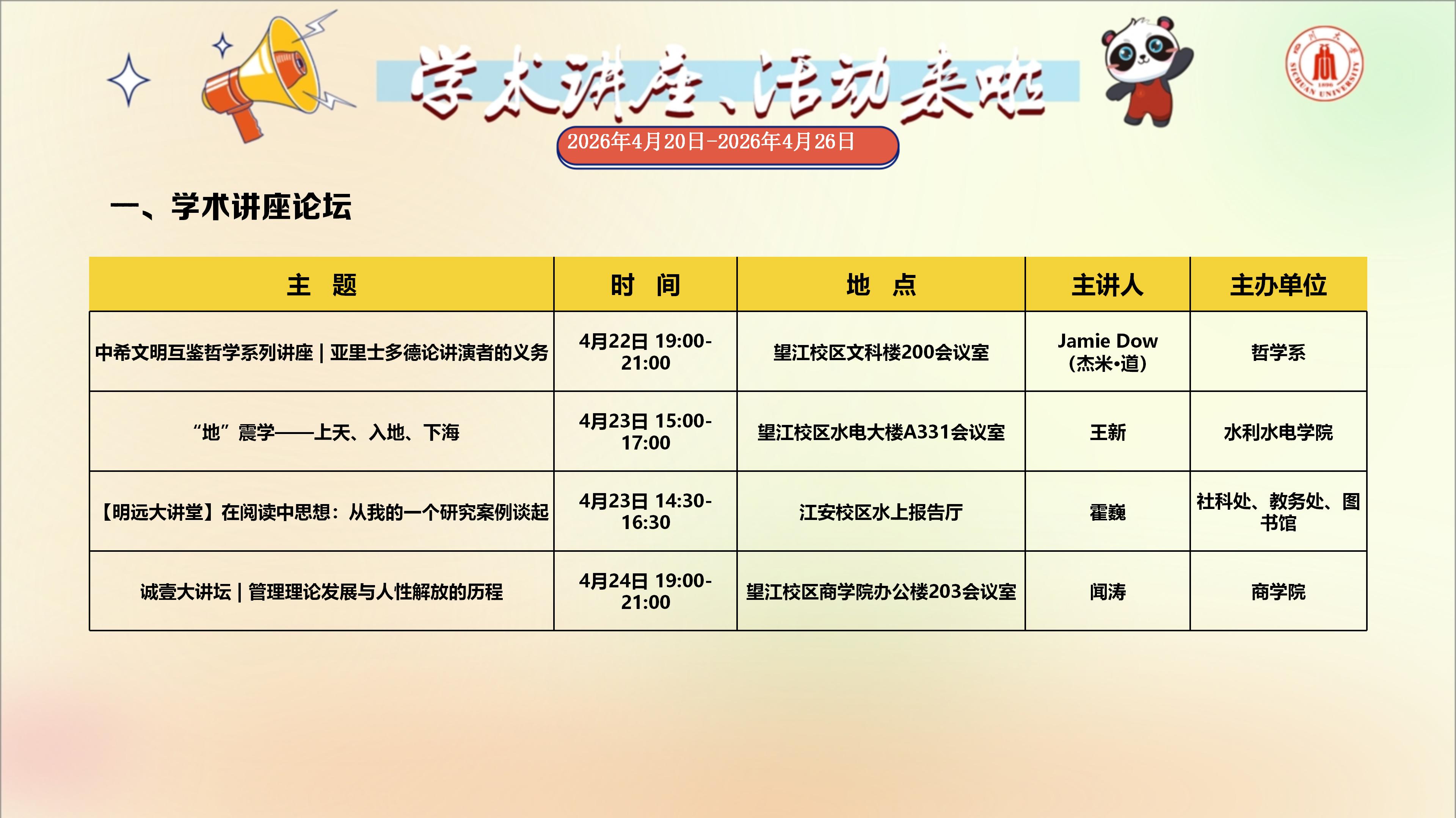 学术讲座与校园文化活动预告(2026年4月20日-2026年4月26日)