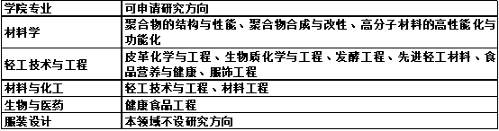 当前设有轻工类含轻化工程专业、食品科学与工程专业、生物工程(轻工生物)专业、服装与服饰设计4个本科专业。拥有材料学、轻工技术与工程、服装设计共3个学术型硕士学位授权点,有材料与化工、生物与医药共2个专业型硕士学位授权点。有材料学和轻工技术与工程2个科学博士学位授权点、材料与化工和生物与医药2个工程博士学位授权点及博士后流动站2个。