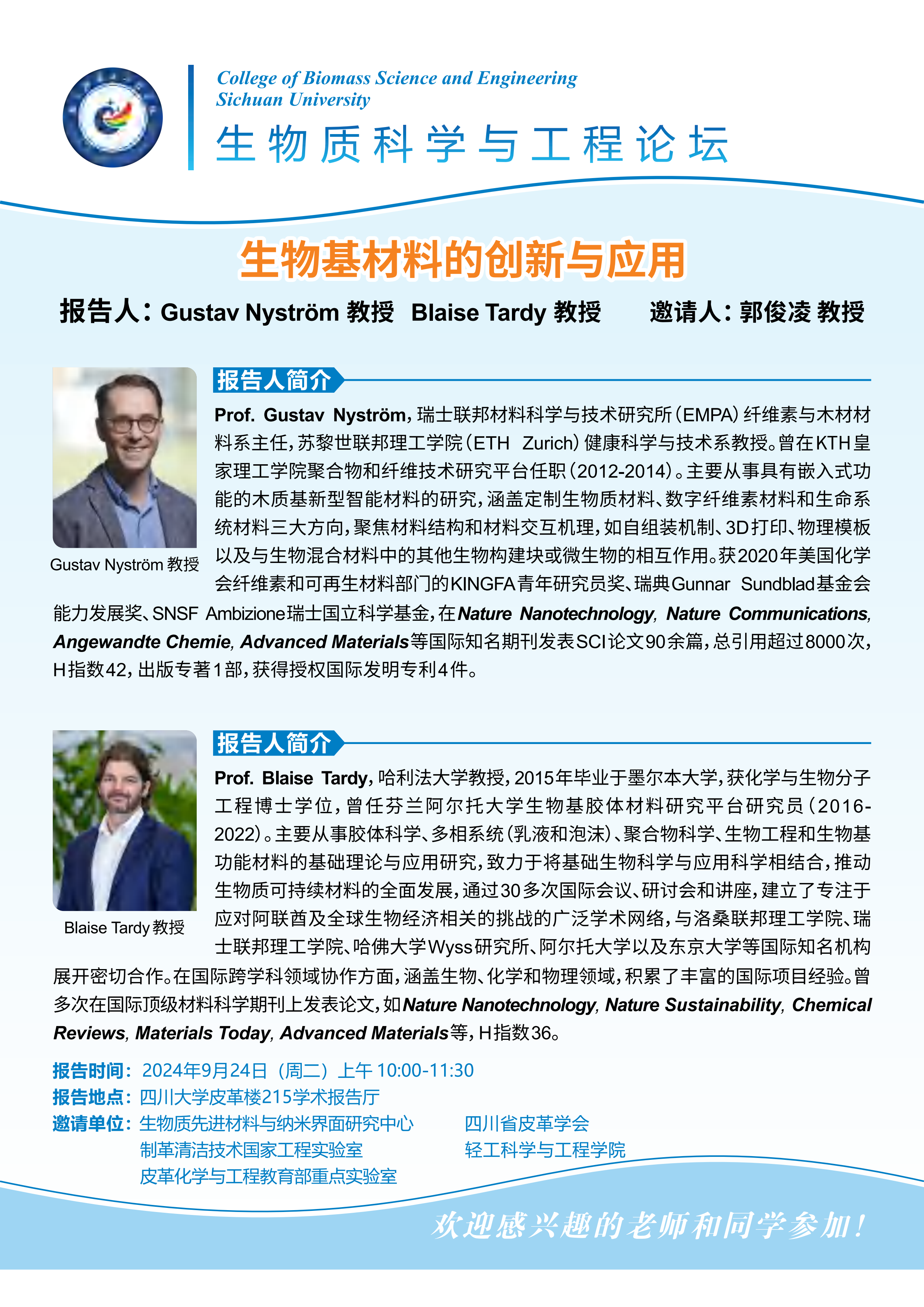 生物质科学与工程论坛:Gustav Nyström教授、Blaise Tardy教授学术报告