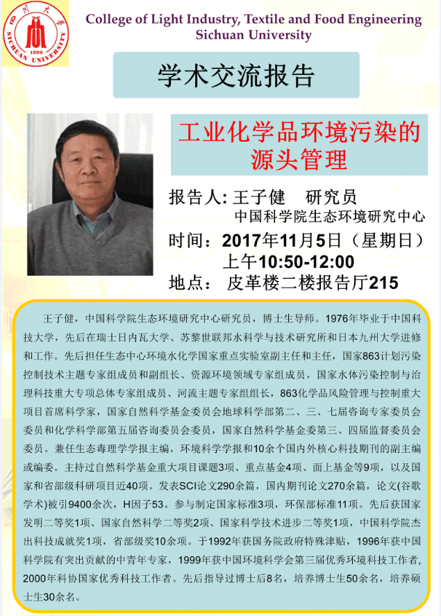 报告题目:工业化学品环境污染的源头管理报告人: 王子健 研究员 中国科8bo足球比分 生态环境研究中心时间:2017年11月5日(星期日) 上午10:50-12:00地点: 皮革楼二楼报告厅215