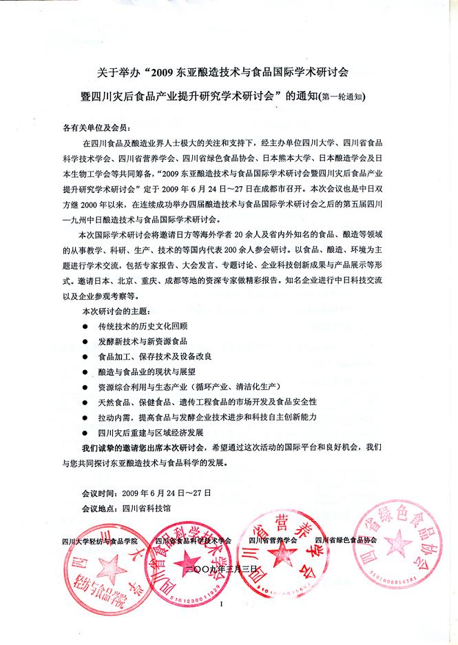 关于举办“2009东亚酿造技术与食品国际学术研讨会暨四川灾后食品产业提升研究学术研讨会”的通知(第一轮通知) 各有关单位及会员:在四川食品及酿造业界人士极大的关注和支持下,经主办单位四川大学、四川省食品科学技术学会、四川省营养学会、四川省绿色食品协会、日本熊本大学、日本酿造学会及日本生物工学会等共同筹备,“2009东亚酿造技术与食品国际学术研讨会暨四川灾后食品产业提升研究学术研讨会”定于2009年6月24日~27日在成都市召开。本次会议也是中日双方继2000年以来,在连续成功举办四届酿造技术与食品国际学术研讨会之后的第五届四川—九州中日酿造技术与食品国际学术研讨会。本次国际学术研讨会将邀请日方等海外学者20余人及省内外知名的食品、酿造等领域的从事教学、科研、生产、技术的等国内代表200余人参会研讨。以食品、酿造、环境为主题进行学术交流,包括专家报告、大会发言、专题讨论、企业科技创新成果与产品展示等形式。邀请日本、北京、重庆、成都等地的资深专家做精彩报告。知名企业进行中日科技交流以及企业参观考察等。本次研讨会的主题:l 传统技术的历史文化回顾 l 发酵新技术与新资源食品l 食品加工、保存技术及设备改良l 酿造与食品业的现状与展望l 资源综合利用与生态产业(循环产业、清洁化生产)l 天然食品、保健食品、遗传工程食品的市场开发及食品安全性l 拉动内需,提高食品与发酵企业技术进步和科技自主创新能力l 四川灾后重建与区域经济发展我们诚挚的邀请您出席本次研讨会,希望通过这次活动的国际平台和良好机会,我们与您共同探讨东亚酿造技术与食品科学的发展。 会议时间:2009年6月24日~27日会议地点:四川省科技展览馆 四川大学8bo足球比分