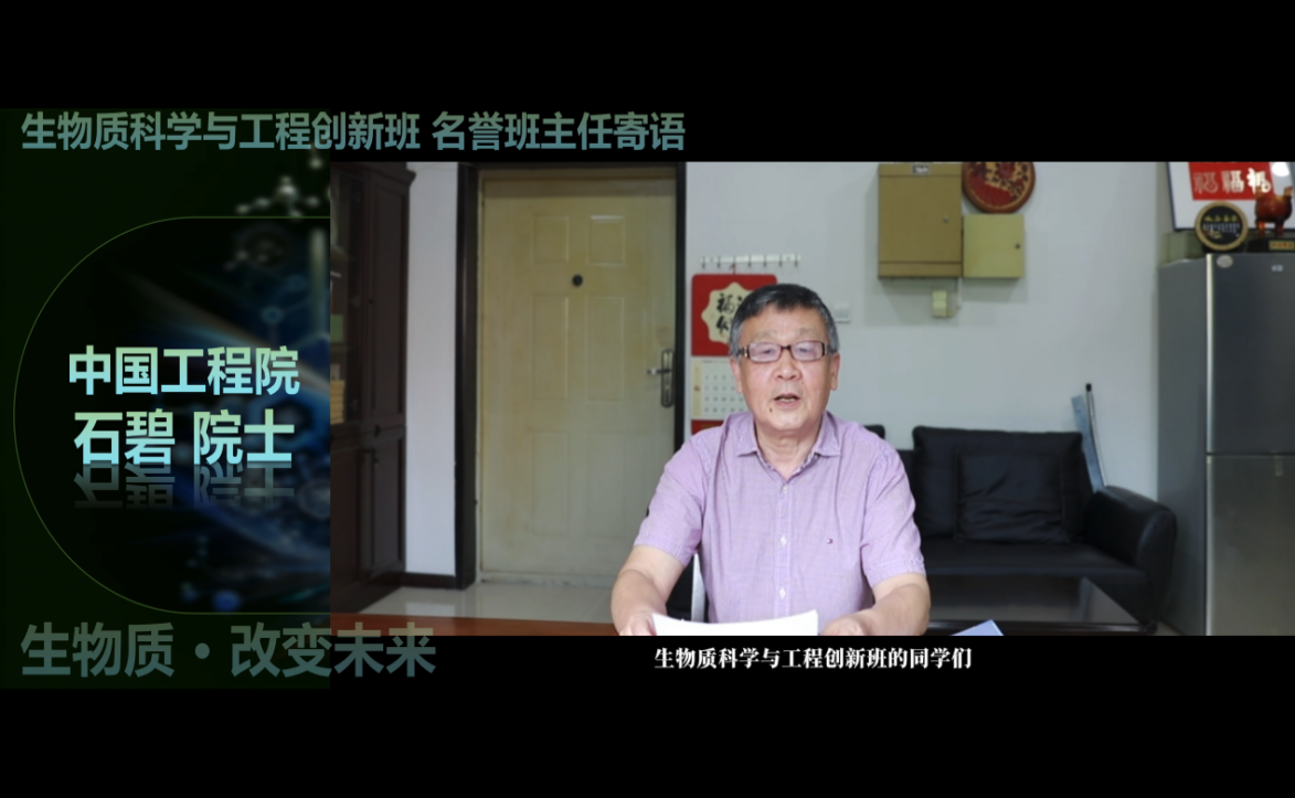 创新班名誉班主任石碧院士通过视频方式发表深情寄语。石院士表示,随着全球对可持续发展的关注度不断提高,生物质科学与工程作为一门新兴交叉学科,肩负着解决资源短缺、环境污染等重大问题的使命。学院设立生物质科学与工程创新班,正是为了培养一批具有创新精神和实践能力的高素质人才,满足国家和社会对该领域专业人才的迫切需求。石院士鼓励同学们要敢于挑战科研的“无人区”,勇于冲击学术前沿的“制高点”,努力在生物质科学与工程领域取得创新性成果�