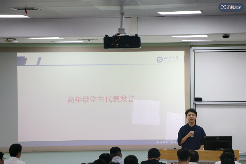随后,教师代表王亚楠教授发言。王亚楠教授给大家分享了自己在川大的求学生活,同时提出了四点建议:一是保持好奇心和求知欲;二是学会自我管理和时间规划;三是积极参加校园活动与社会实践;四是保持积极乐观的心态。“愿你们怀抱梦想又脚踏实地。”这是王亚楠教授对同学们提出的期许�