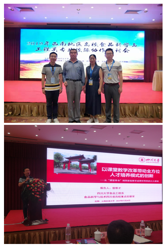 2019年7月20日,西南地区高校食品科学与工程类专业校际协作研讨会在云南农业大学召开。四川大学农产品加工研究院名誉院长卢晓黎教授、食品工程系主任吕远平教授、副系主任迟原龙副教授、教研室主任曾维才副教授应邀出席大会,并积极参与了新形势下食品类专业的学科建设、研究生培养、本科教育改革和工程教育专业认证经验的交流和讨论。会上,曾维才副教授做了主题为“以课堂教学改革带动全方位人才培养模式的创新-从课堂革命到国家级教学成果特等奖的川大探索”的报告,现场反响热烈,受到了与会专家的一致好评,极大地扩大了川大食品学科的影响力。