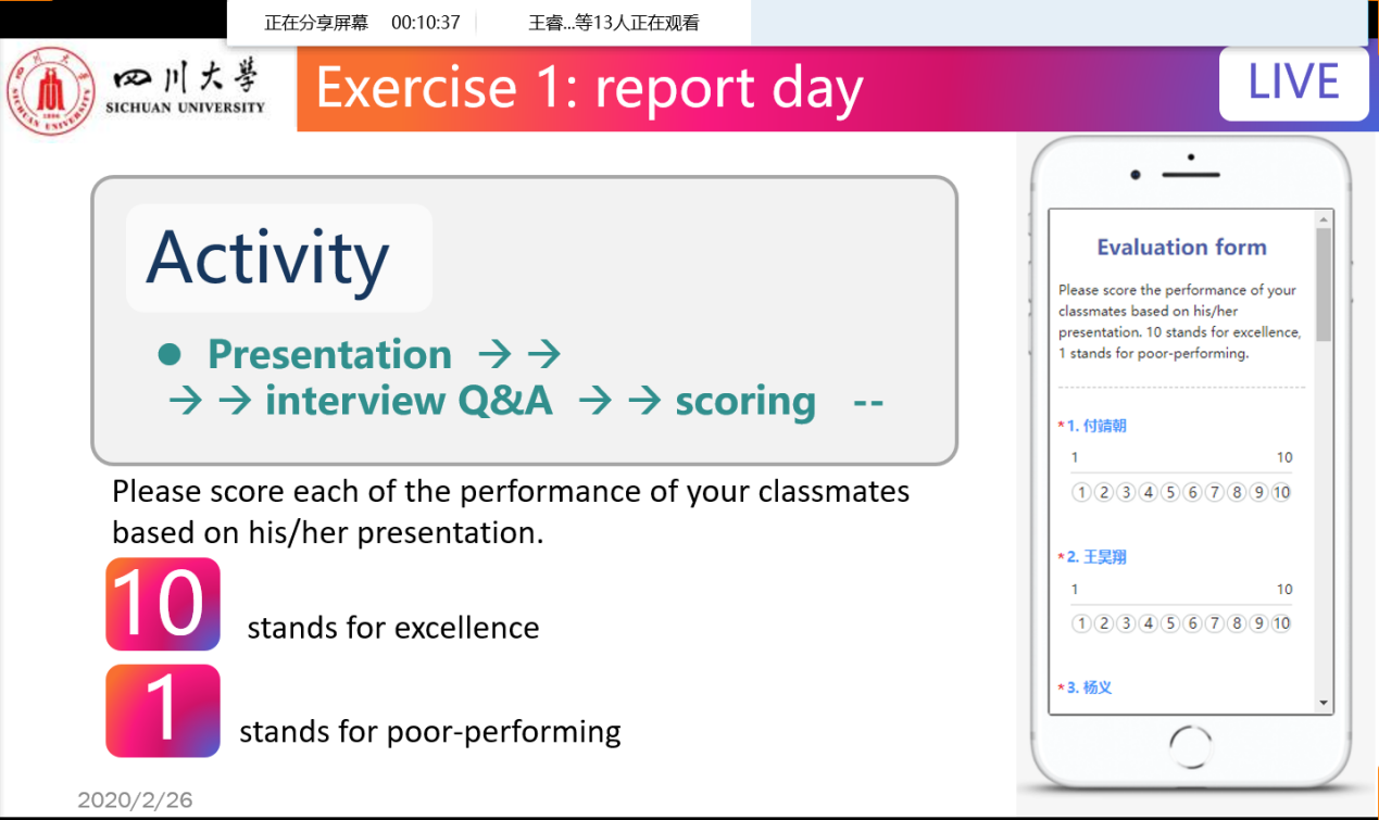针对学生学习特点,金老师积极关注学生需求,成功构建具有舒适度和安全感的“在线学习社区”,让学生积极参与课堂,逐渐化解学生的交流障碍,进入潜意识的正规场合学习模式。首先,他建立了一套“社区制度”,从政策上鼓励学生全程参与课堂活动�