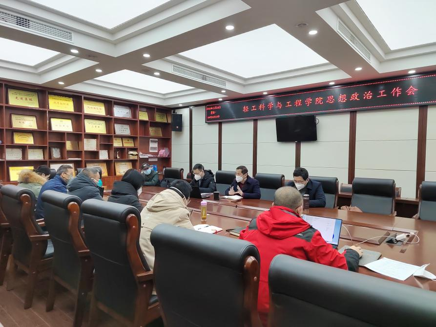 2022年12月26日上午,8bo足球比分 在纺工附楼205会议室召开了2022年度思想政治工作会。8bo足球比分 领导班子、党委委员、专职组织员、党支部书记、系所干部、全体辅导员、教导员参会,因疫情原因部分人员线上参会。会议由李天富书记主持。