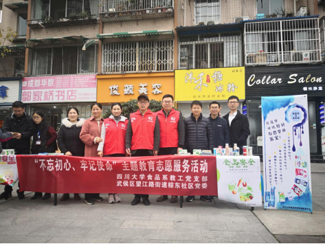 为深入贯�“不忘初心、牢记使命”主题教育精神,以实际行动践行初心和使命�20191127上午,食品教工党支部联合武侯区望江路街道棕东社区党委开展了一次以“不忘初心、牢记使命”为主题的志愿服务活动。本次活动旨在普及食品安全科学知识,促进民众踊跃参与食品安全共建、共享和共治,切实保障人民群众“舌尖上的安全”�