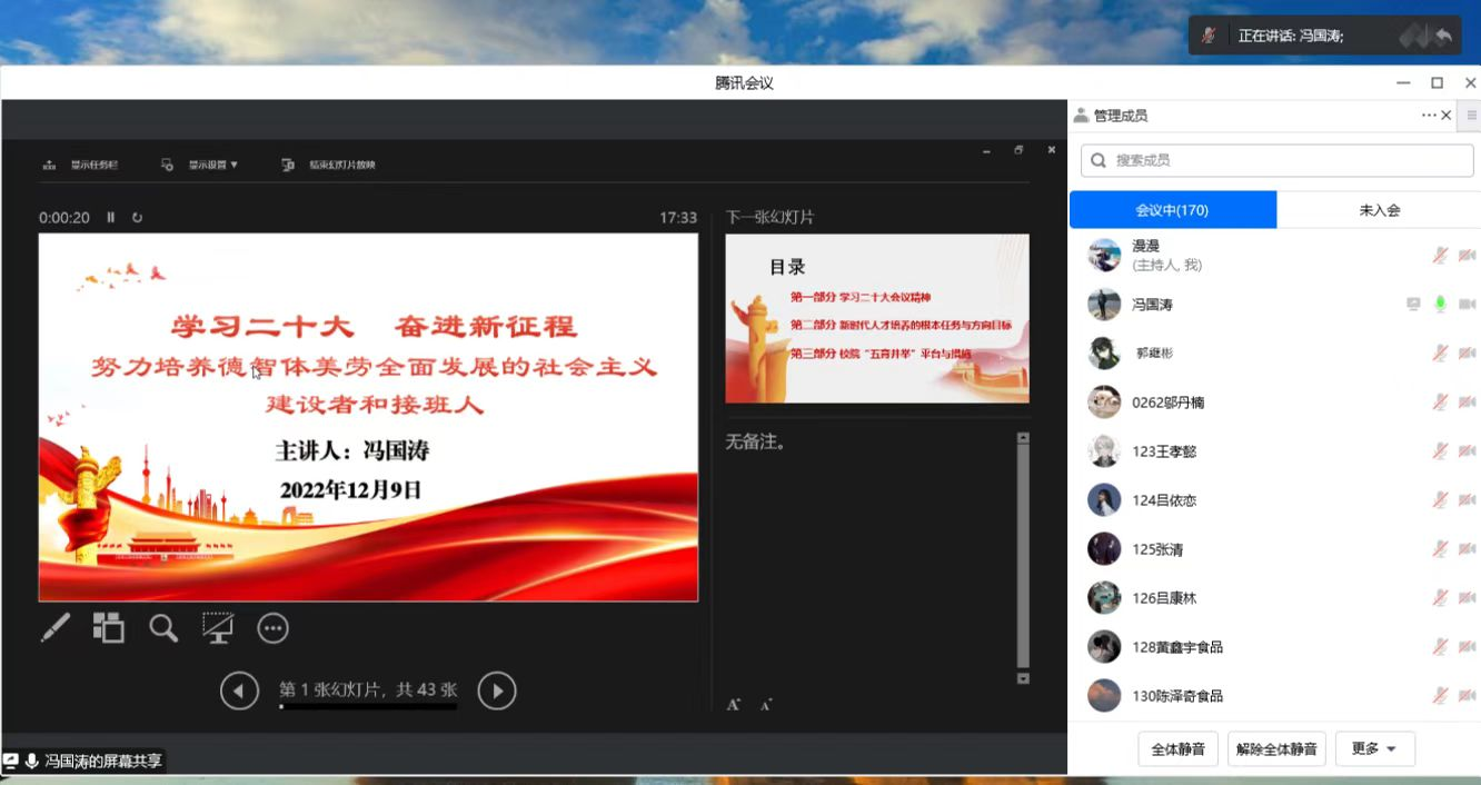 首先,冯国涛副书记带领大家一起学习党的二十大会议主要内容,主要从深刻把握党的二十大主题和主要成果、过去五年的工作和新时代十年的伟大变革、开辟马克思主义中国化时代化新境界的历史责任、以中国式现代化全面推进中华民族伟大复兴的使命任务、全面建设社会主义现代化国家的目标任务、加强党的全面领导和全面从严治党的部署要求、应对风险挑战的重要要求七个方面进行了全面讲授。