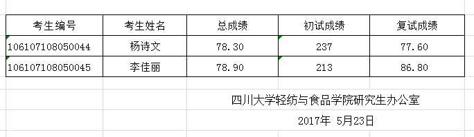 四川大学8bo足球比分 纺研所2017年博士研究生招生入学成绩公示