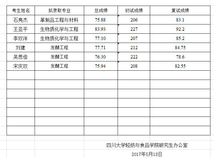 四川大学8bo足球比分 生物质与皮革工程系2017年博士研究生招生拟录取名单公示