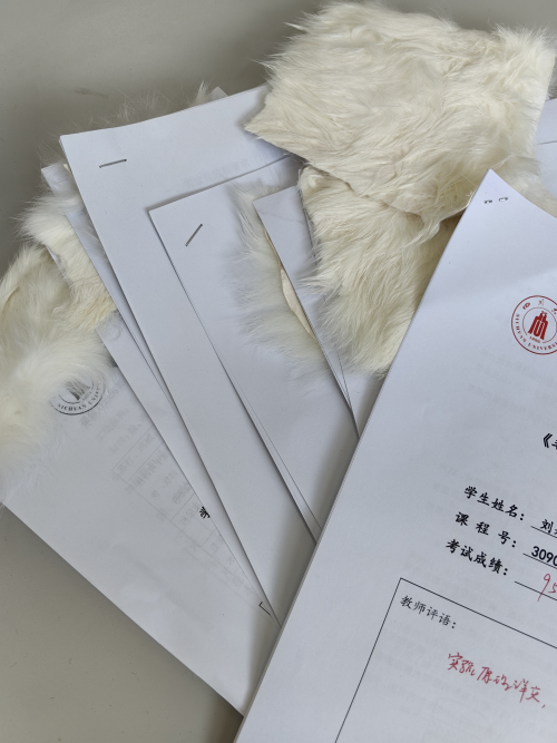 2020级本科生在完成《毛皮工艺学》理论学习之后,走出教室,走进皮革工艺实验室。首先,任课教师王亚楠教授和周建飞教授讲解了实验方案,强调了兔皮加工的要点;随后,学生们两人一组按照实验方案开始实验,对家兔原料皮进行了一系列加工操作(包括浸水、脱脂、浸酸、软化、鞣制、加脂、干整理复鞣等),经过几天的努力,成功将家免原料皮制成了美观实用的本色兔毛皮产品。