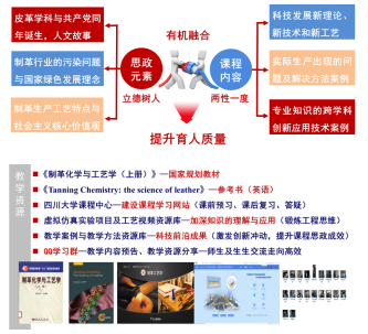 开展课程教学内容的系统重构。将科技前沿成果融入课程。针对知识更新滞后的问题,建设以行业科技发展的新理论、新技术为主的教学案例库,提升教学内容的前沿性和时代性。积极利用现代信息手段丰富课程教学资源,先后建成了《制革工艺学》线上课程平台;《制革脱毛生产实训及脱毛效果可视化监测虚拟仿真实验项目》;可视化制革工艺教学视频库等。经过多年的发展,已经建成了以国家规划教材为基础的、虚实结合、线上线下融合的教学资源体系;为丰富教学方法奠定了基础,并为提高学生对工程认知提供了工具。