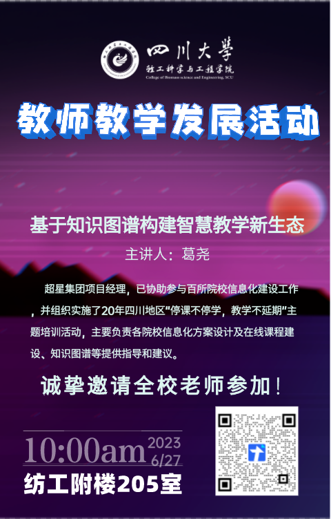 21日举行的“一个划时代的教育范式跃迁”活动引发了老师们对知识图谱的极大兴趣,应老师要求,于2023年6月27日在四川大学望江校区纺工附楼205会议室开展了主题为“基于知识图谱构建数字教学新生态”的教师教学发展活动。