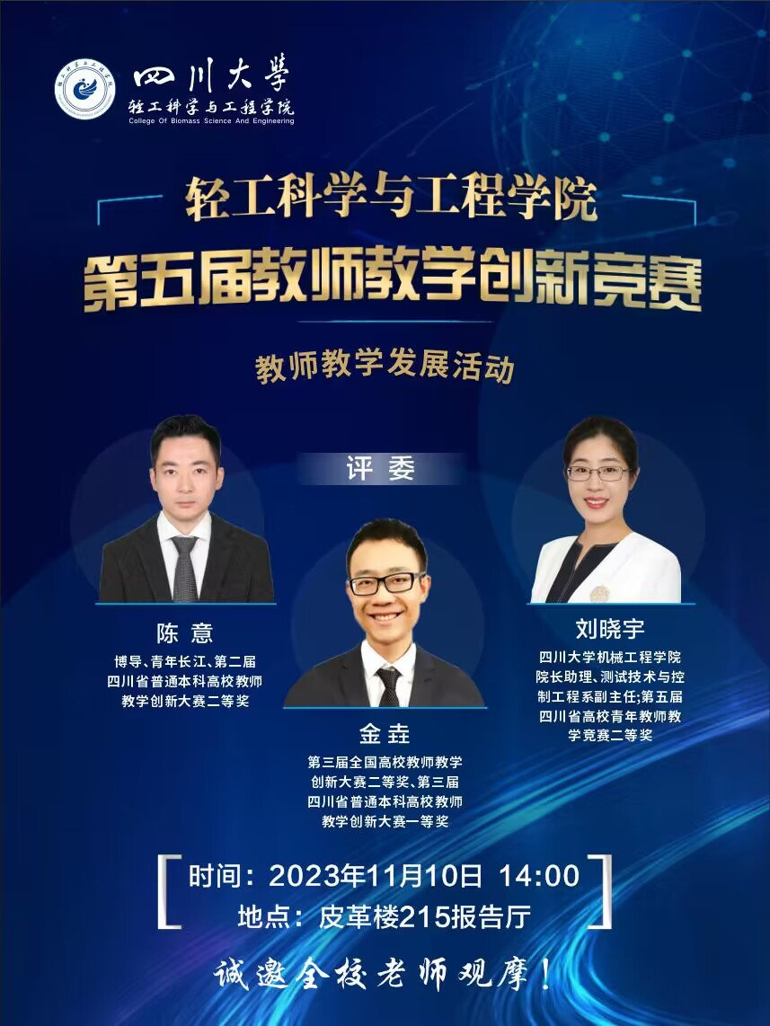 第五届“探究式-小班化”教学竞赛在望江校区皮革楼215报告厅室举行。本次竞赛主题为“推动教学创新 培养一流人才”,旨在深度践行“以学为中心”的教学改革,引导教师潜心追求卓越教学学术与学科学术的有机融合,以“信息+”助力教育教学创新,实现教书育人并重,同时为“第四届四川省普通本科高校教师教学创新大赛”、“第七届四川省青年教师教学竞赛”和学校第七届教师教学创新竞赛做好相关准备。