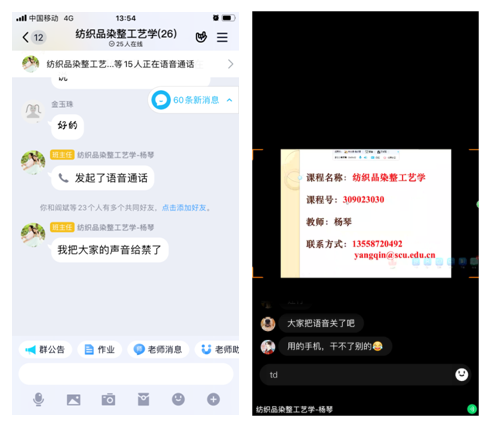 部署,对线上课程进行督查,本着不影响教学的原则,旁听了杨琴老师的《纺织品染整工艺学》,姚云鹤、赵武老师的《表现色彩》,郭荣辉、朱谱新老师的《纺织品功能整理》,尚娇娇、兰建武老师的《纺织学术报告》,吴芳、吴晶老师的《时装摄影与广告》。老师们主要采用了腾讯会议和QQ视频进行教学、师生互动,配合超星学习通签到,布置作业等,他们都能熟练地使用线上教学工具,较好地完成了线上教学任务。