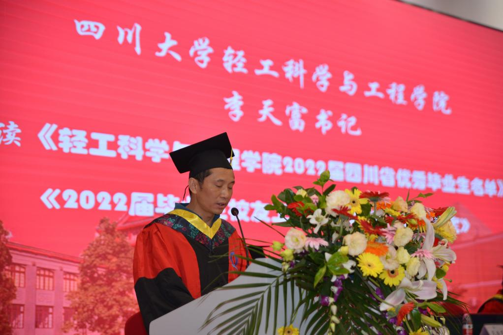 学院党委李天富书记宣读《轻工科学与工程学院2022届省优秀毕业生名单》和�2022届毕业生校友工作年级联络人聘任决定》,李天富书记、彭必雨院长、周建飞副院长分别为四川省优秀毕业生和校友联络人颁奖�