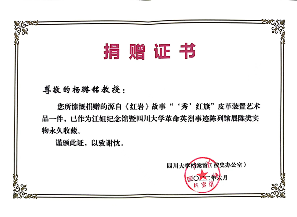 紧接着举行作品揭幕仪式,由冯兵教授和李天富书记共同为作品揭幕。随后杨璐铭教授对《“秀”红旗》作品进行了详细介绍,冯兵教授向杨璐铭教授颁发捐赠证书�