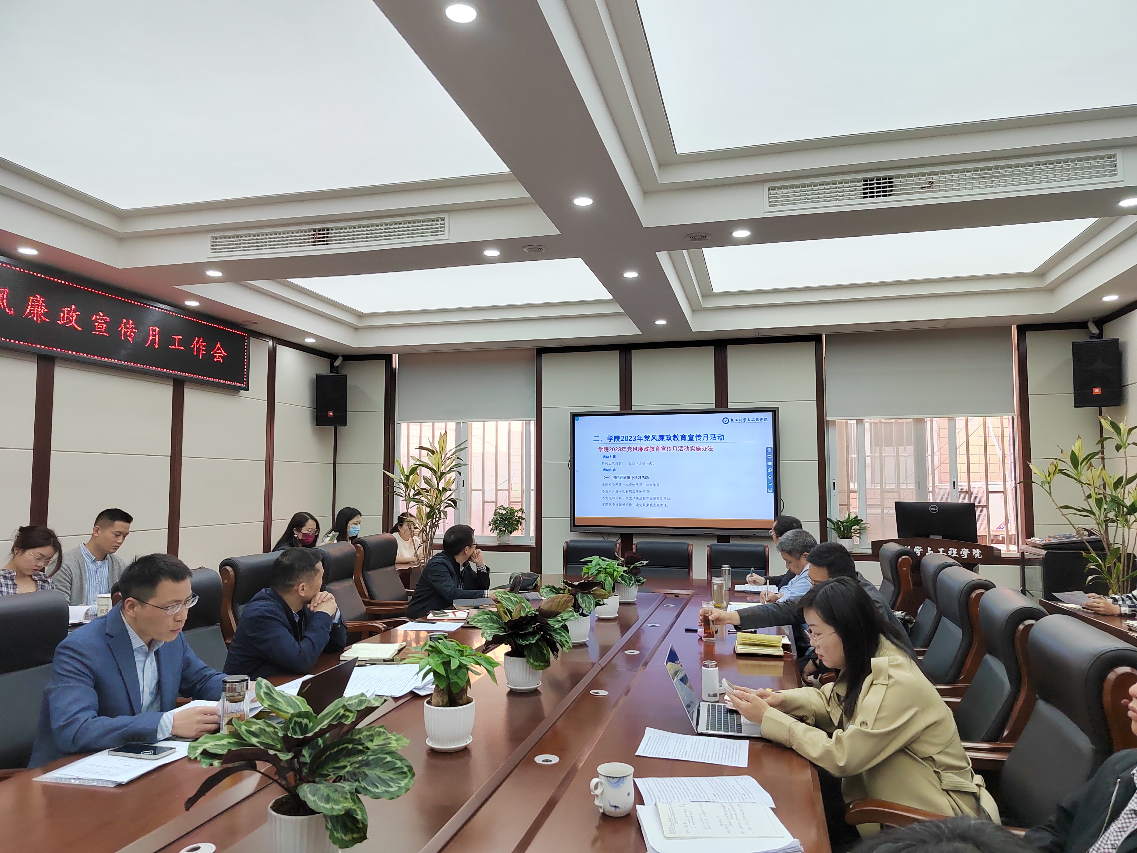 �2023�党风廉政教育宣传月工作会上,冯国涛副书记首先围绕“新风正气润初心,担当作为创一流”的主题介绍了学�2023年党风廉政教育宣传月活动实施办法,并要求院内各单位、各党支部要将党风廉政教育宣传月活动与师德师风、科研诚信、学术诚信教育等贯通融合,并与学科专业建设、师资队伍、人才培养等工作统筹协调、一体推进,并力戒形式主义、官僚主义,确保活动取得实效,最终形成常态化、长效化党风廉洁教育机制�