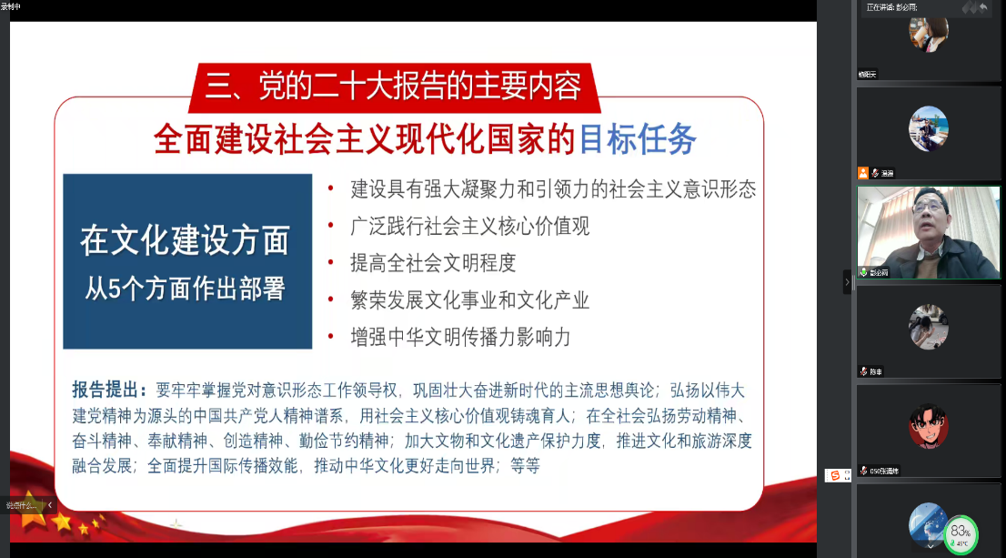 2022年12月9日下午,彭必雨院长为2022级本科生讲授“学习二十大,奋进新征程——着力造就拔尖创新人才,聚天下英才而用之”的形势与政策课。2022级辅导员贺婷老师以及2022级全体本科生以线上形式参加了本次学习。